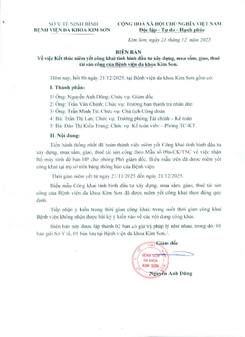 | Tiêu đề văn bản | Biên bản về việc kết thúc niêm yết công khai tình hình đầu tư xây dựng, mua sắm, giao, thuê tài sản công của Bệnh viện Đa khoa huyện Kim Sơn | ||