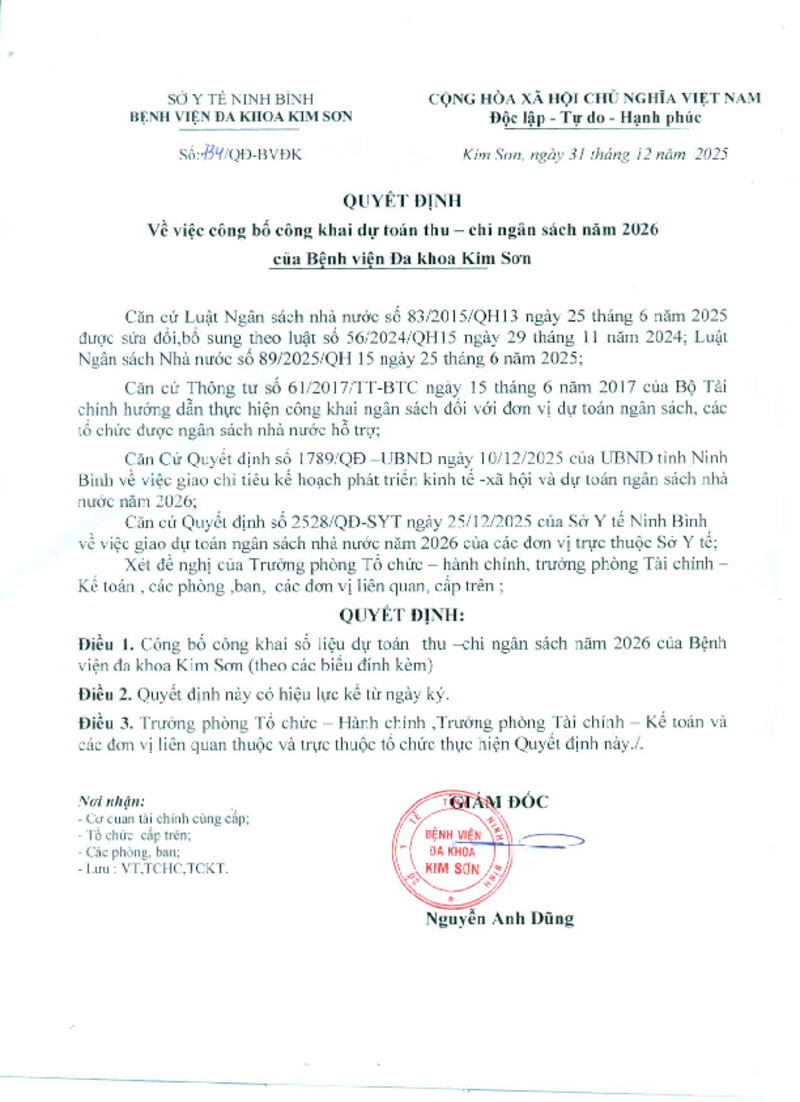 | Tiêu đề văn bản | Quyết định về việc công bố công khai thực hiện dự toán thu - chi ngân sách năm 2026 của Bệnh viện Đa khoa Kim Sơn | ||