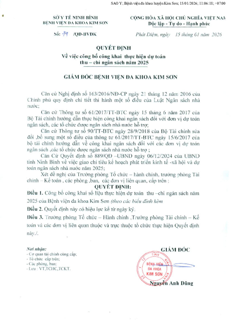 | Tiêu đề văn bản | Quyết định về việc công bố công khai thực hiện dự toán thu - chi ngân sách năm 2025 của Bệnh viện Đa khoa Kim Sơn | ||